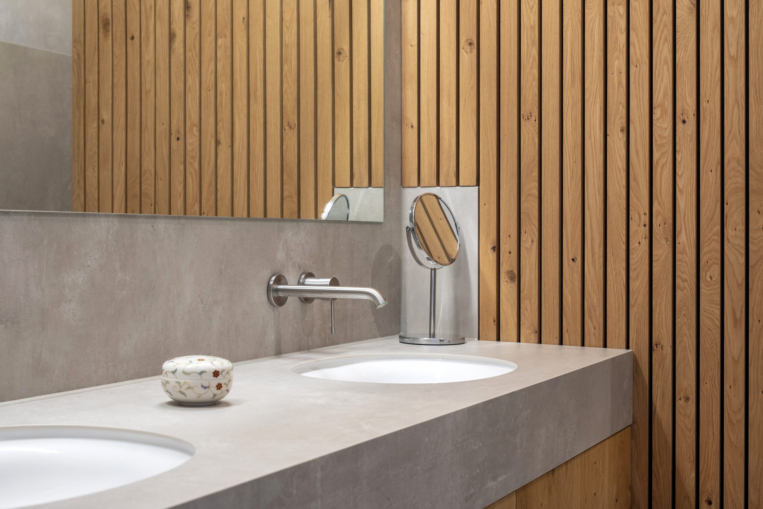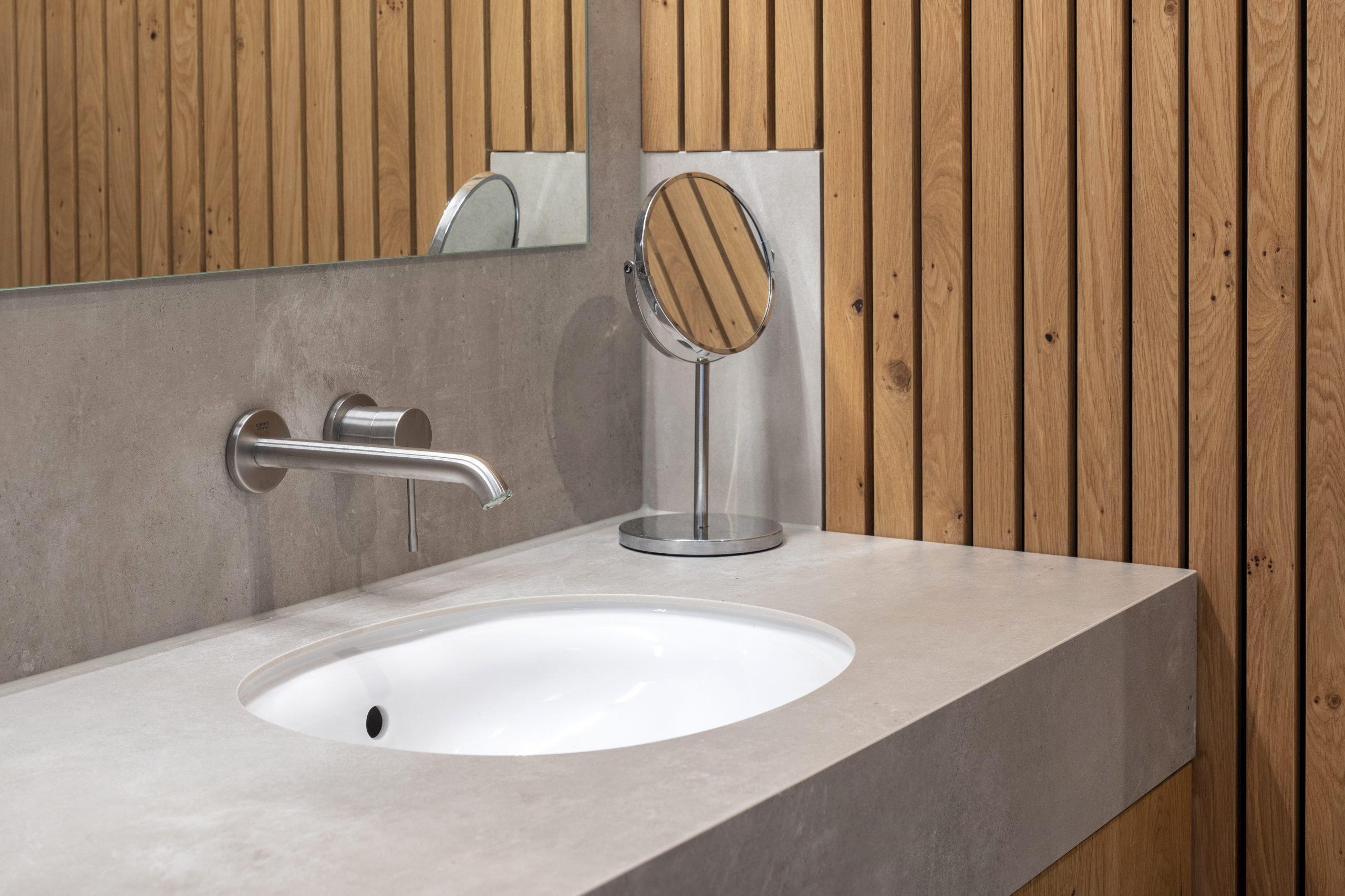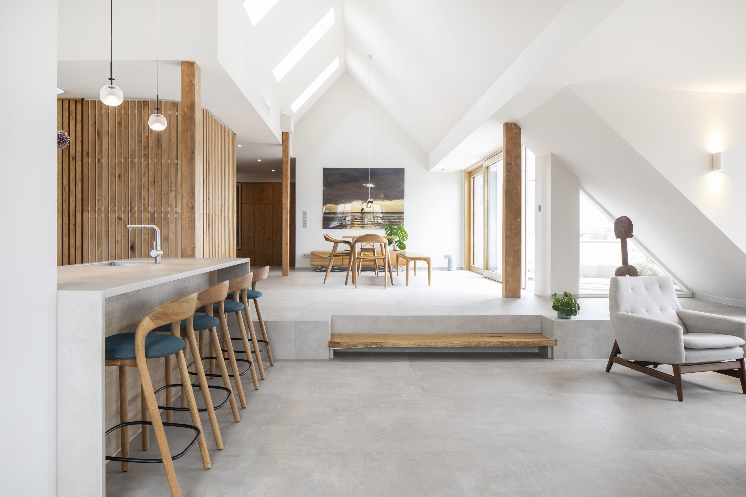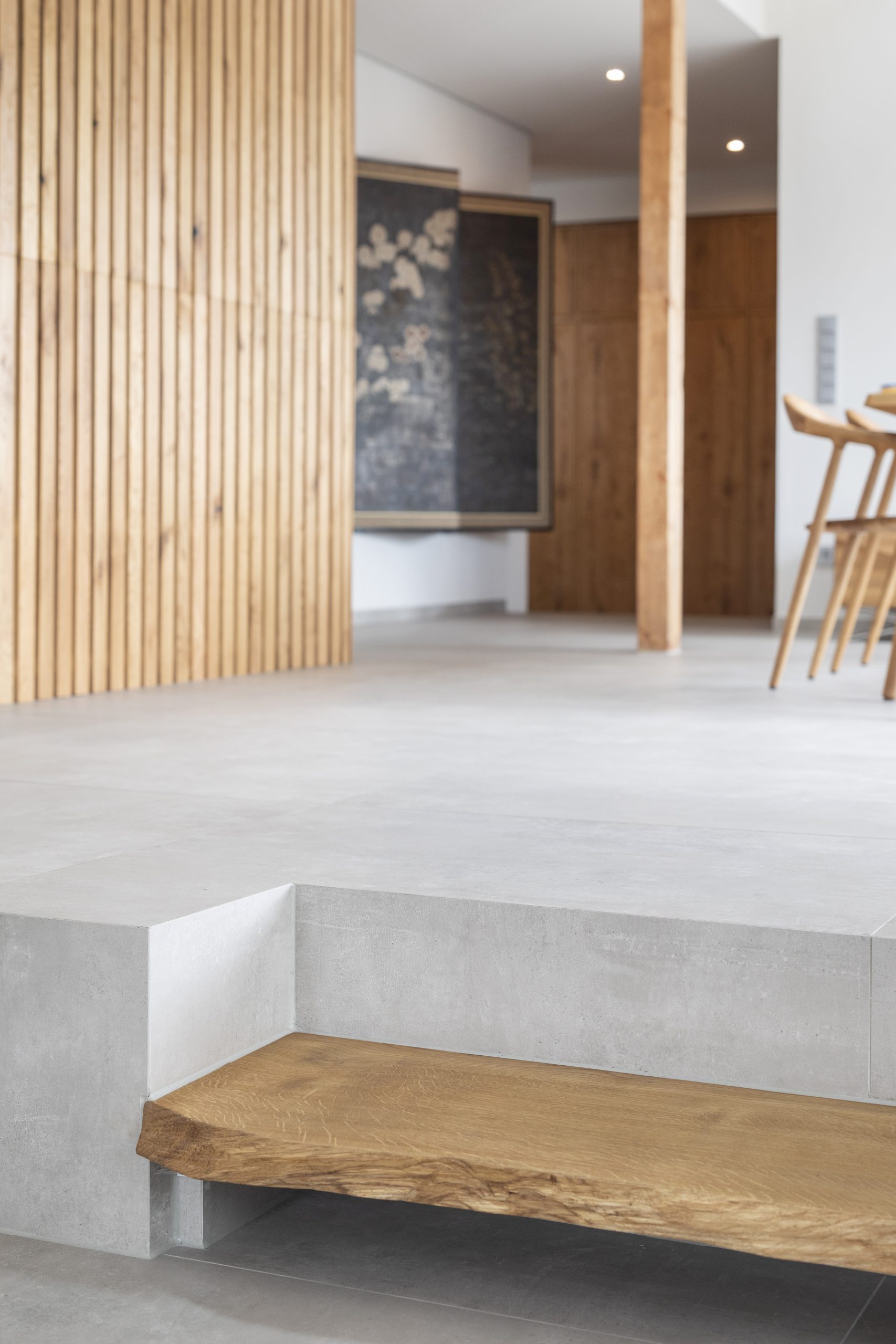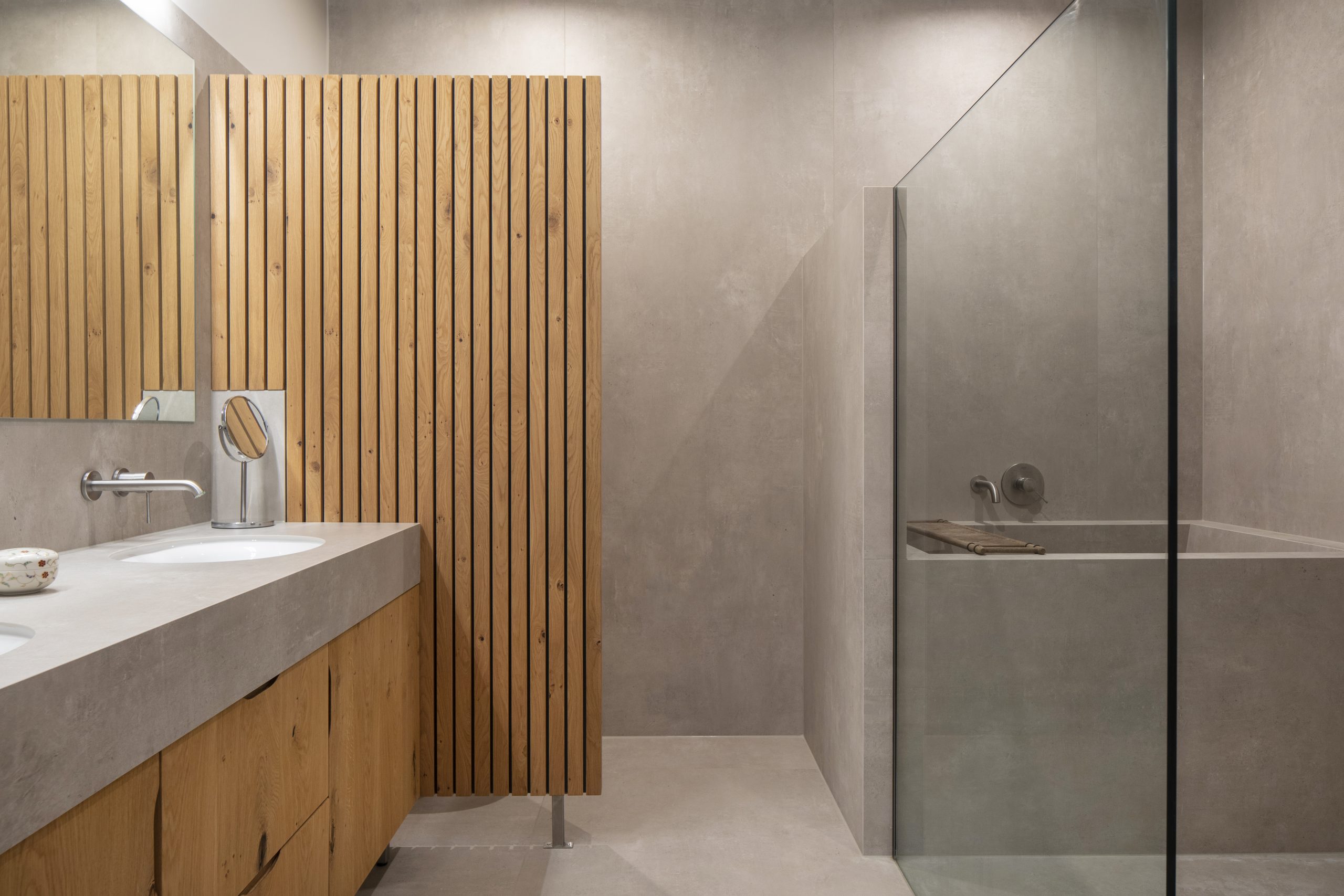 Rund 400 Quadratmeter Urban Great Ivory wurden verarbeitet und bilden eine klare, durchgängige Gestaltungslinie. Vier Bäder, zwei Doppelwaschtische, eine Küche, zwei Terrassen und eine Sitzbadewanne sind in einem einheitlichen Materialkonzept umgesetzt.